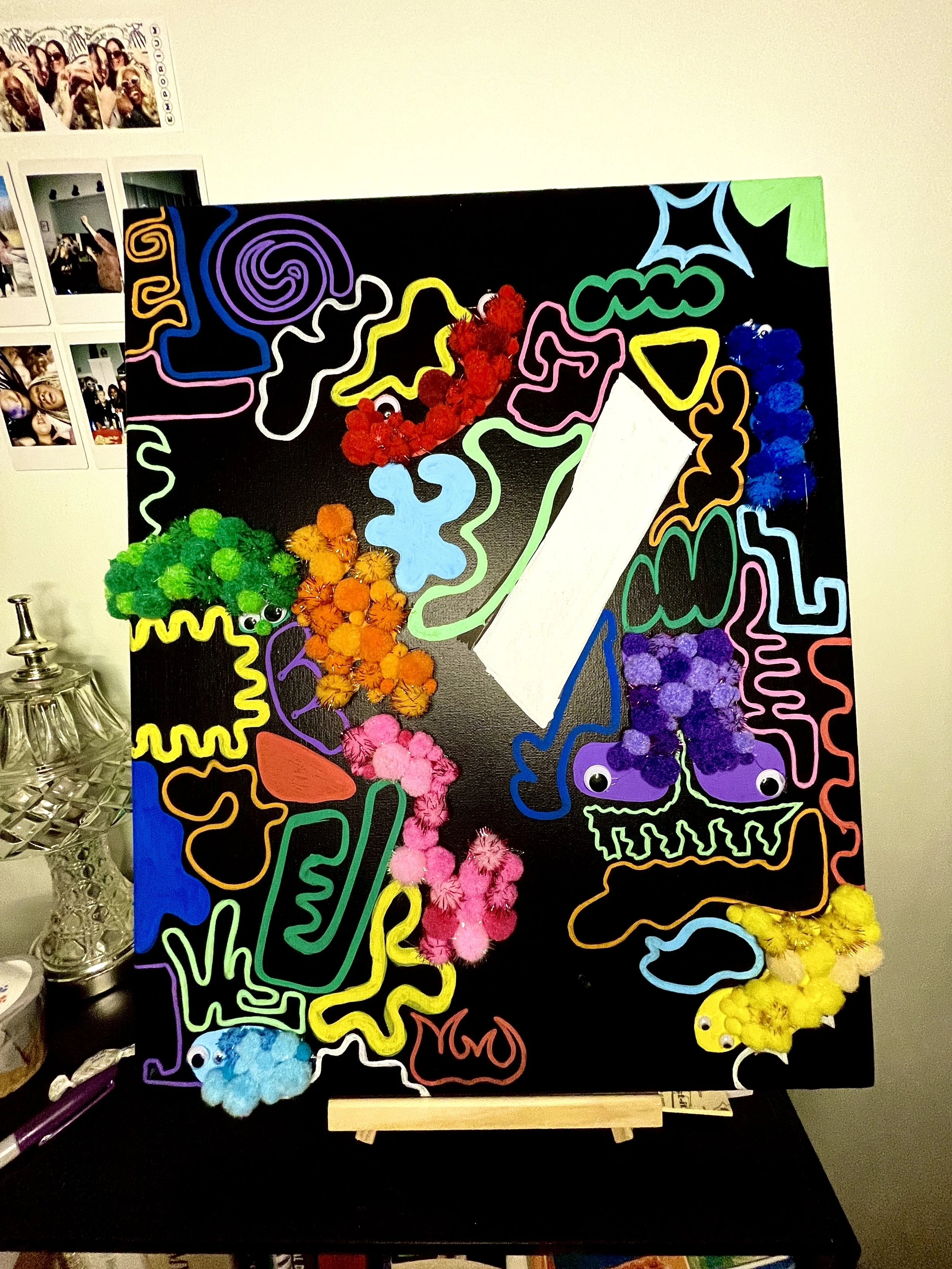 creepy crawlers, june 2023, mixed media painting. canvas, acrylic paint, pom-poms, googly eyes. original work by samm lee.