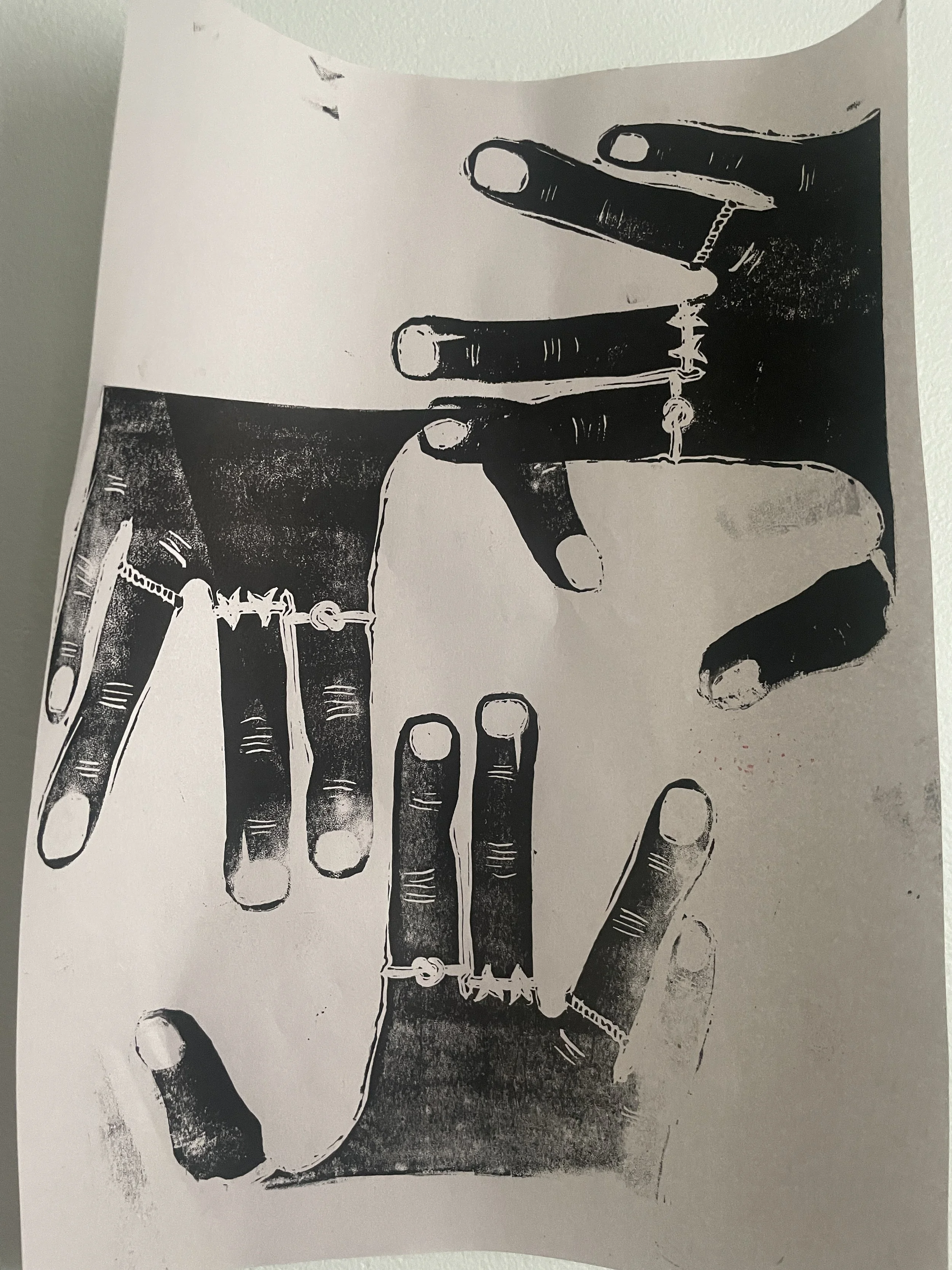 the way I see it, july 2023, linocut print. ink, lino print, newsprint. original work by samm lee.